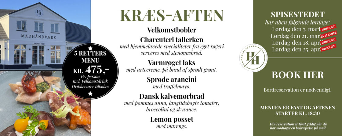 Vi laver mad ud af huset hver dag med undtagelse for søndag. Hvis du ønsker menu-forslag til større arrangementer/fester er du velkommen til at henvende dig telefonisk, så finder vi ud af en løsning sammen.